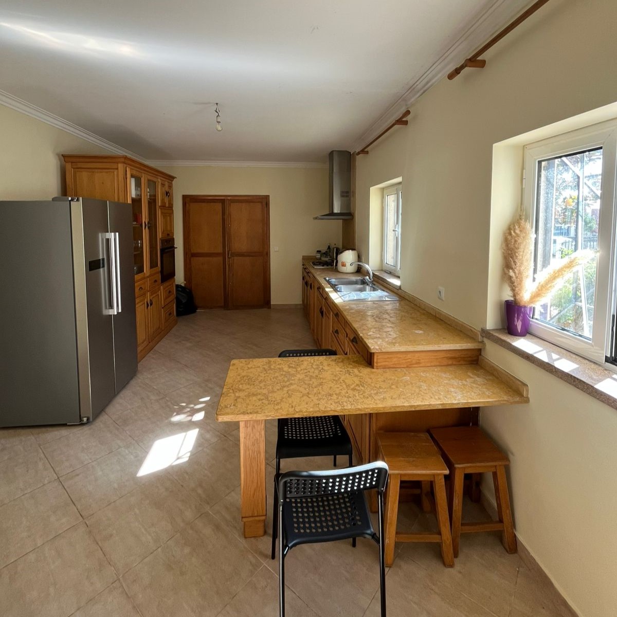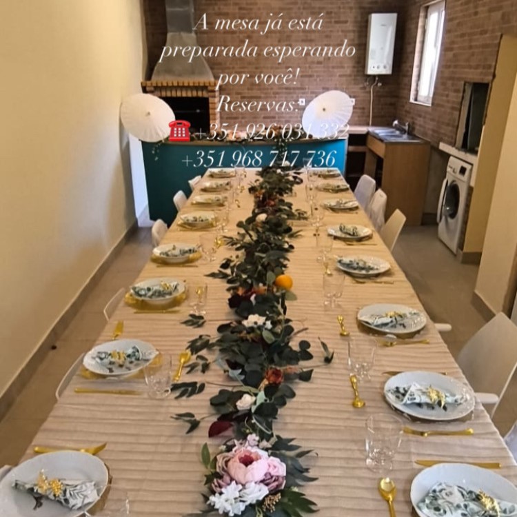 A cozinha dispõe de utensílios básico para refeições, um frigorífico de duas portas (sendo uma delas freezer) forno, fogão, air fryer, tostadeira e cafeteira, assim como panelas, pratos e talheres para az confeção de refeições para 8 pessoas. A máquina de lavar roupa está localizada na área gourmet. Utensílios de limpeza: vassoura e esfregona.