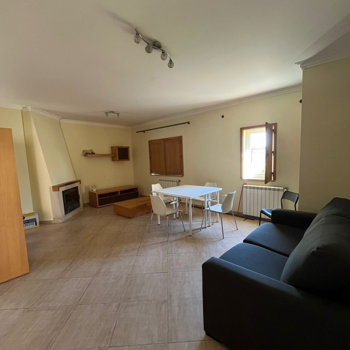 A sala principal tem uma lareira, sofá confortável e uma mesa para pequenas refeições.