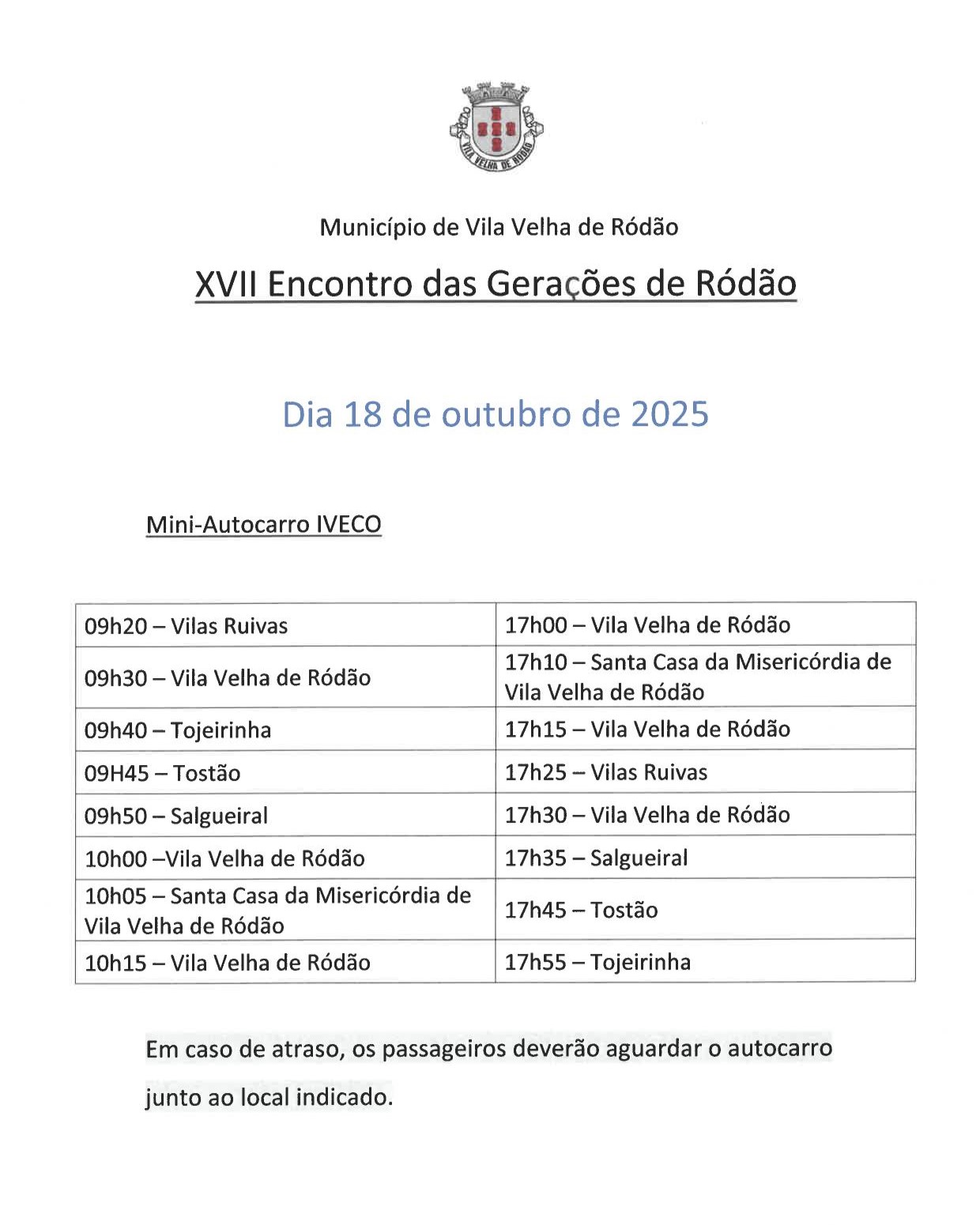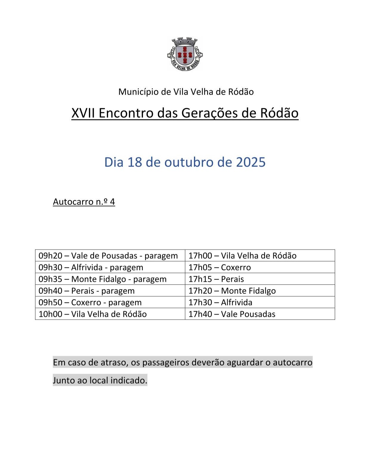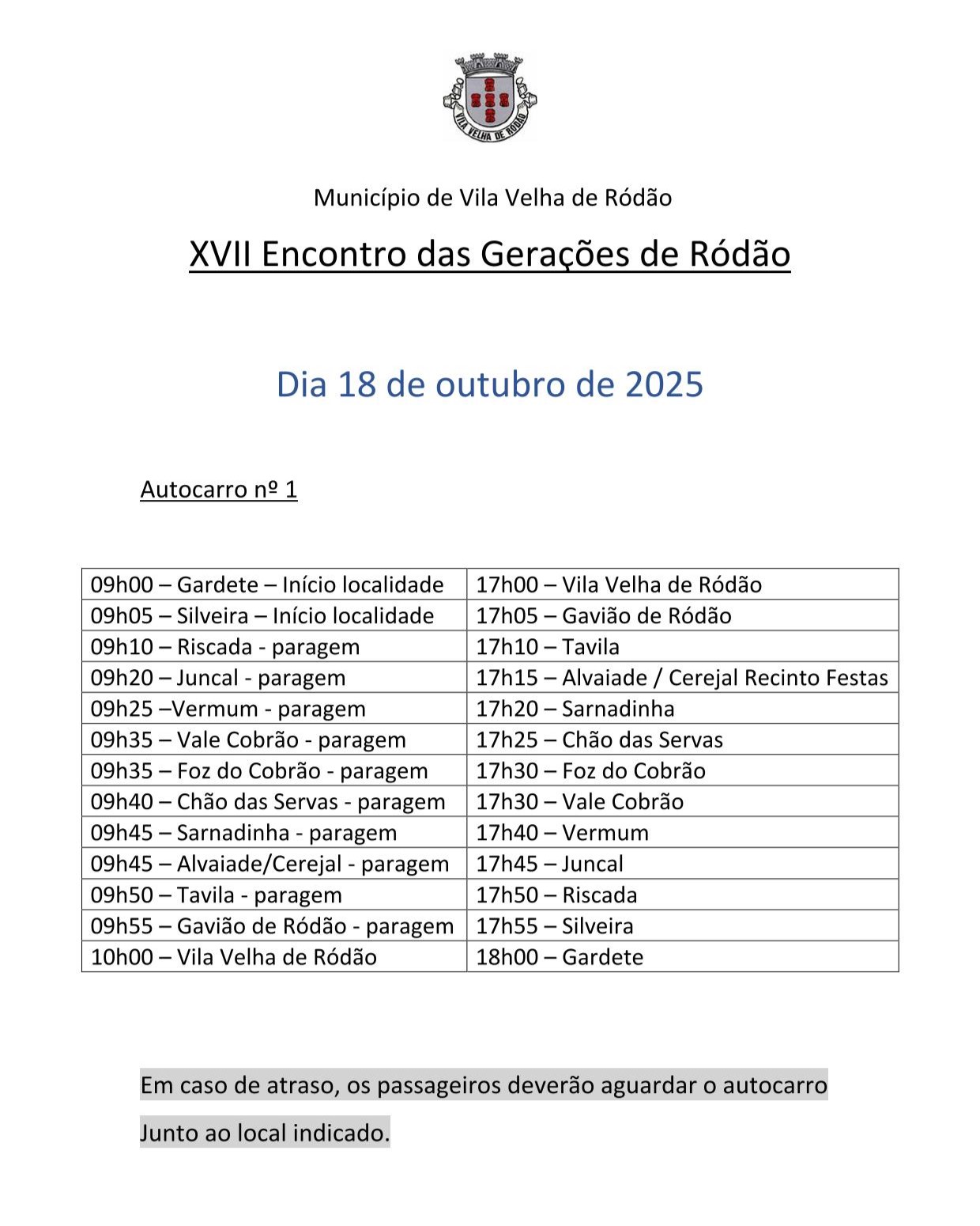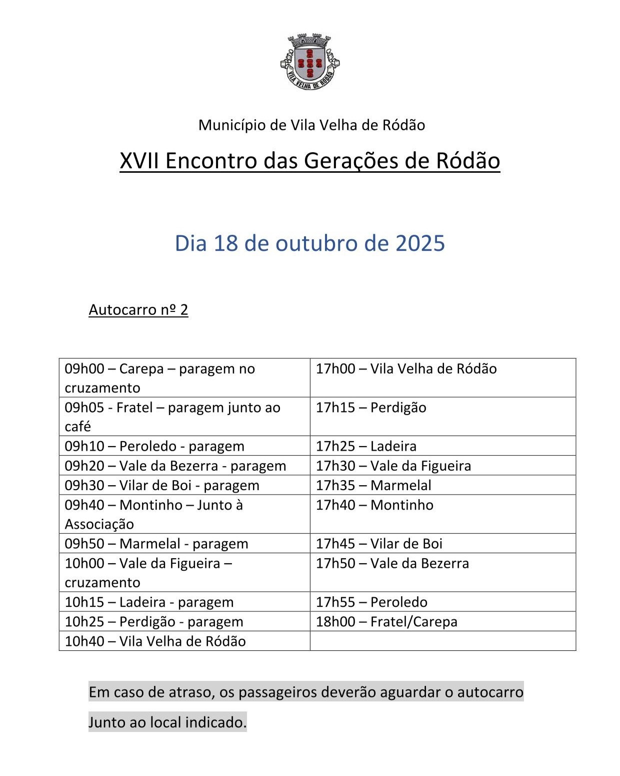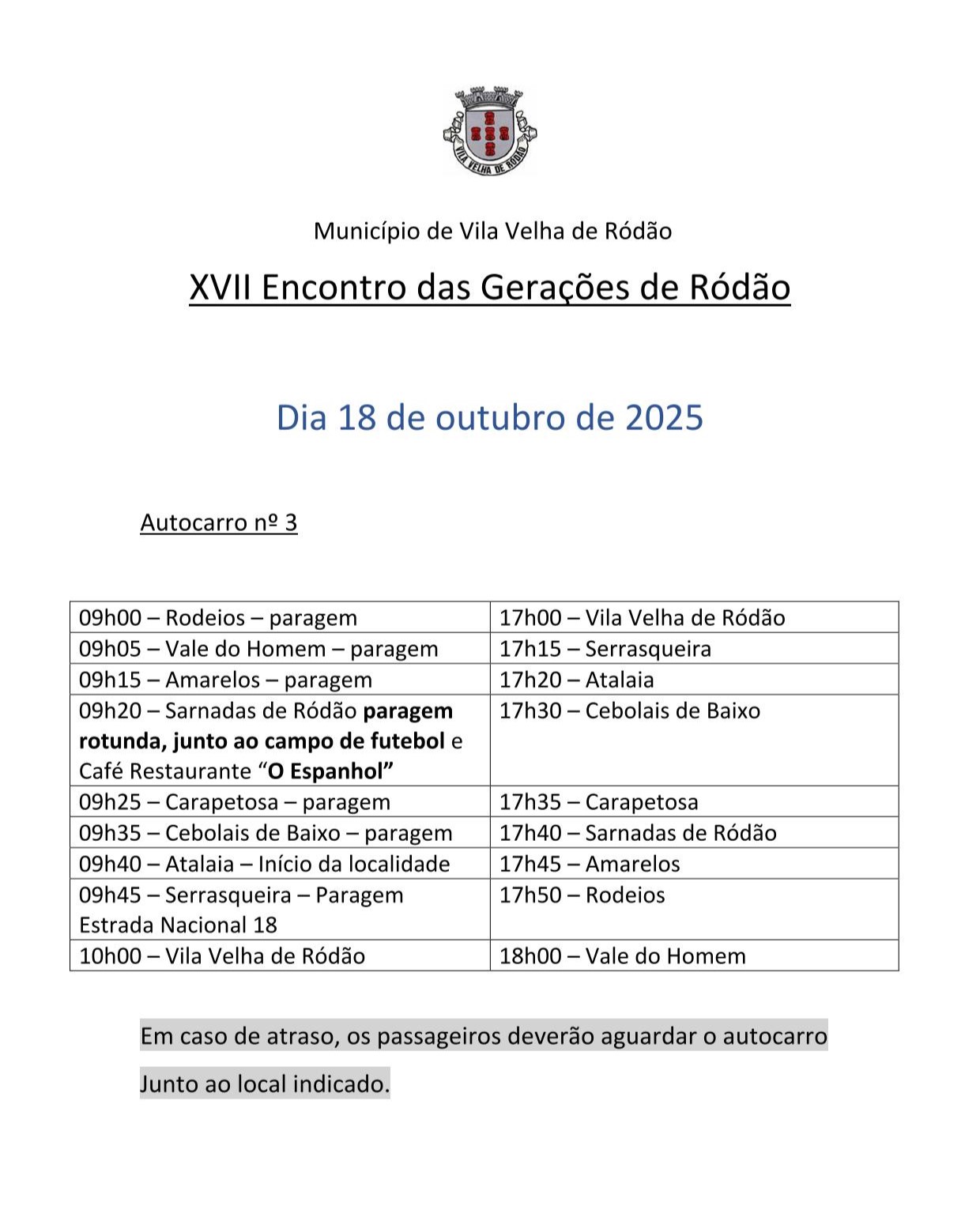 Como habitualmente, o Município de Vila Velha de Ródão disponibiliza o transporte para o XVII Encontro das Gerações de Ródão entre as freguesias e a sede de concelho.