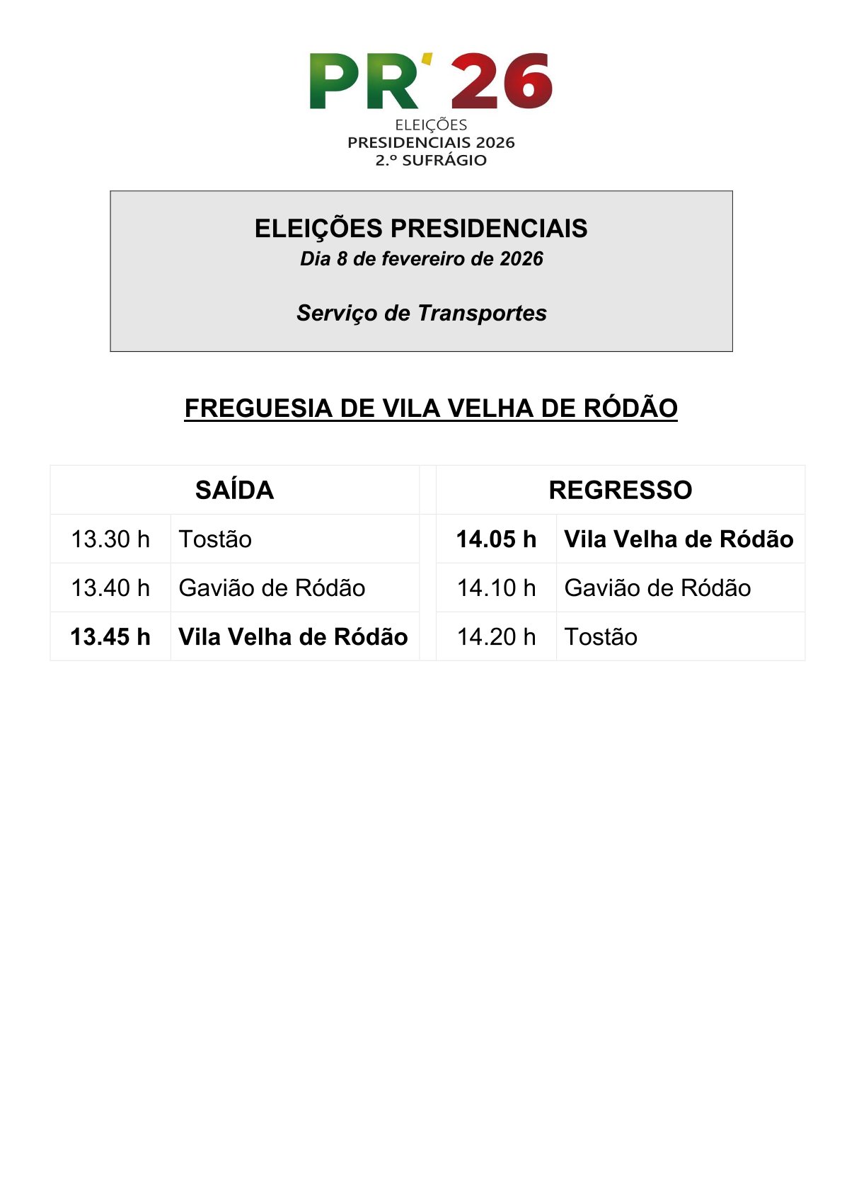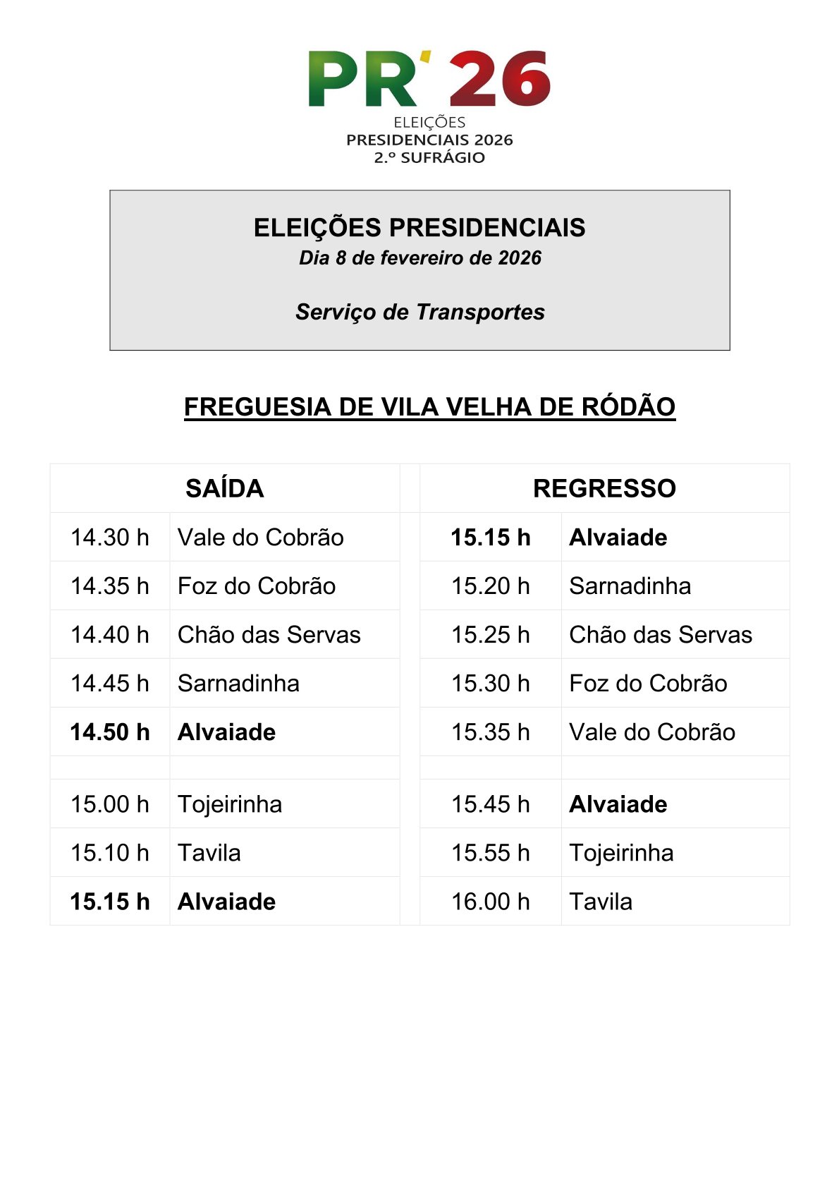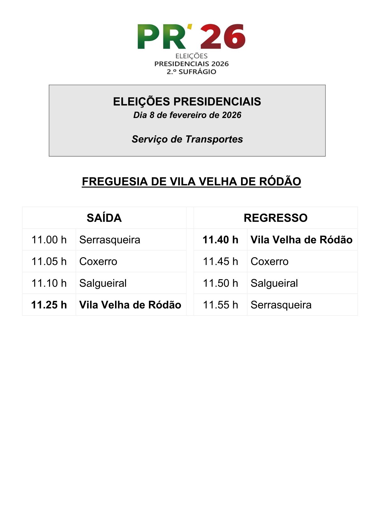De forma a assegurar o direito de voto na 2.ª volta das Eleições Presidenciais que se realiza no domingo, dia 8 de fevereiro, o Município de Vila Velha de Ródão disponibiliza o habitual serviço de transporte para as diferentes secções de voto do concelho, com os horários apresentados nas imagens.