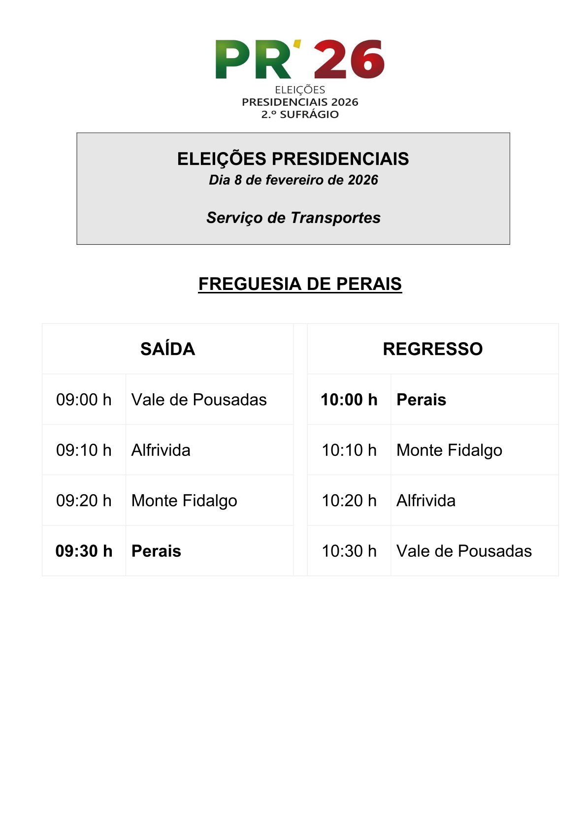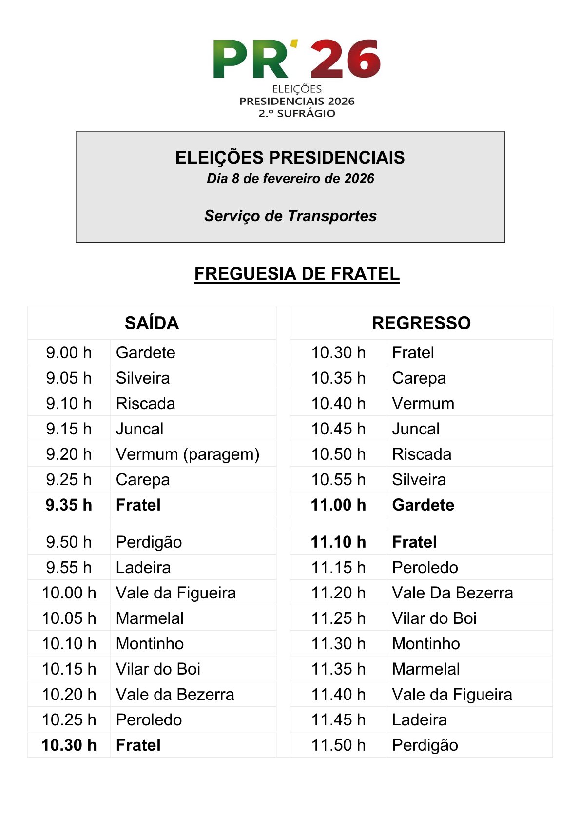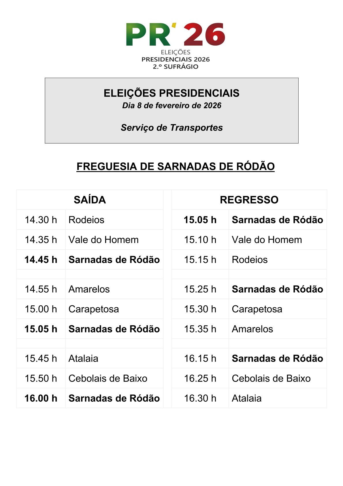 De forma a assegurar o direito de voto na 2.ª volta das Eleições Presidenciais que se realiza no domingo, dia 8 de fevereiro, o Município de Vila Velha de Ródão disponibiliza o habitual serviço de transporte para as diferentes secções de voto do concelho, com os horários apresentados nas imagens.