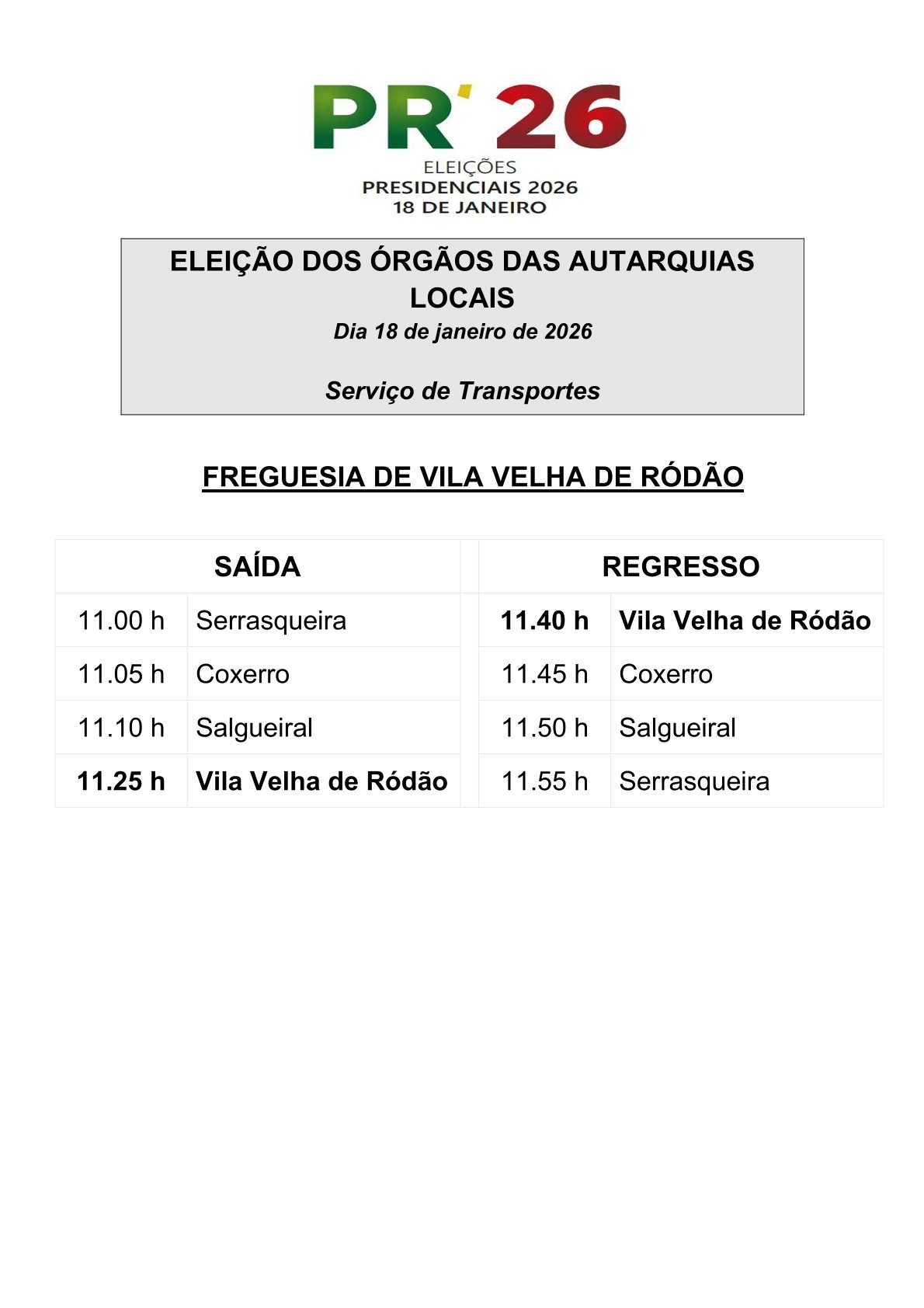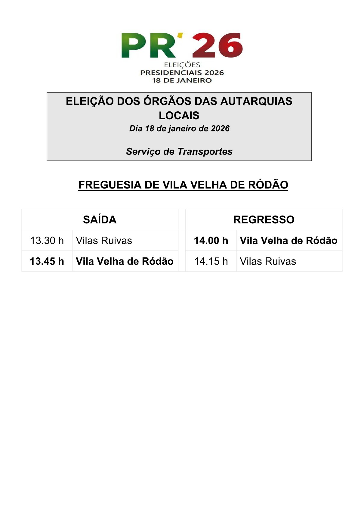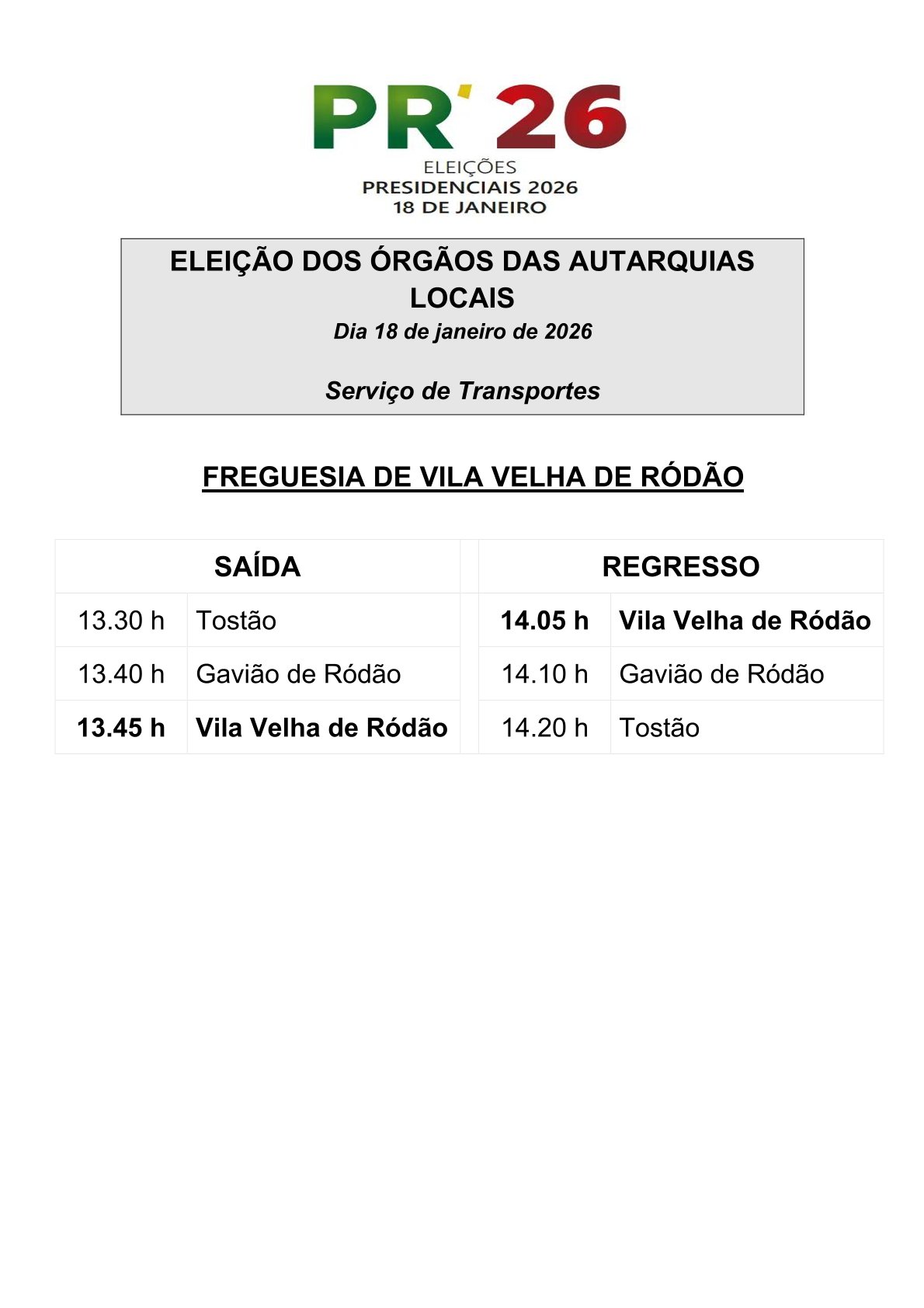 De forma a assegurar o direito de voto na Eleições Presidenciais que se realizam no próximo domingo, dia 18 de janeiro de 2026, o Município de Vila Velha de Ródão disponibiliza o habitual serviço de transporte para as diferentes secções de voto do concelho, com os horários apresentados em baixo, nas imagens.