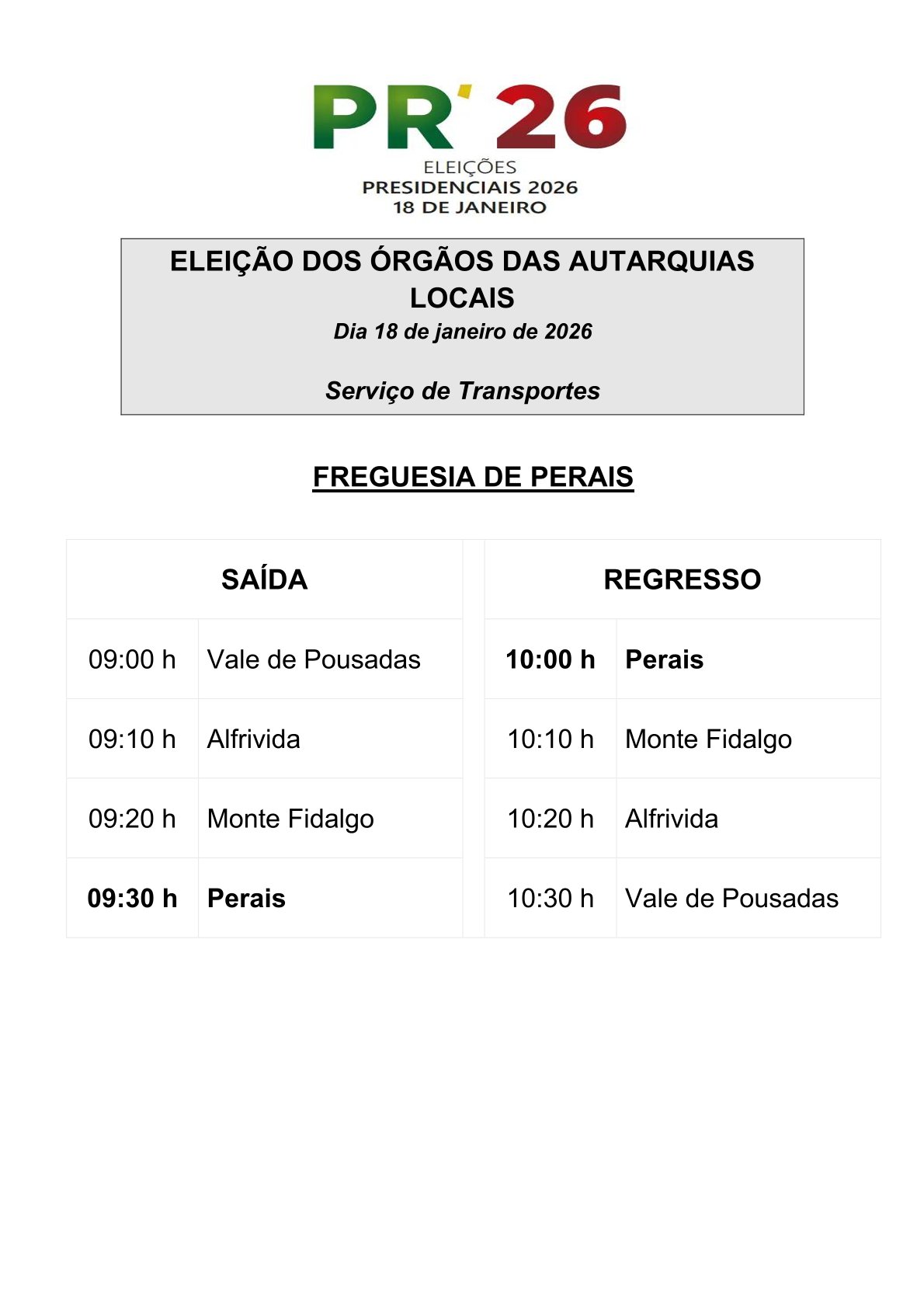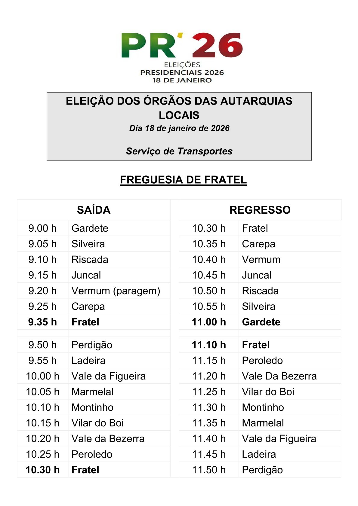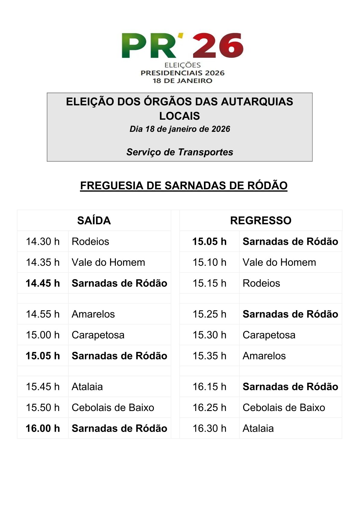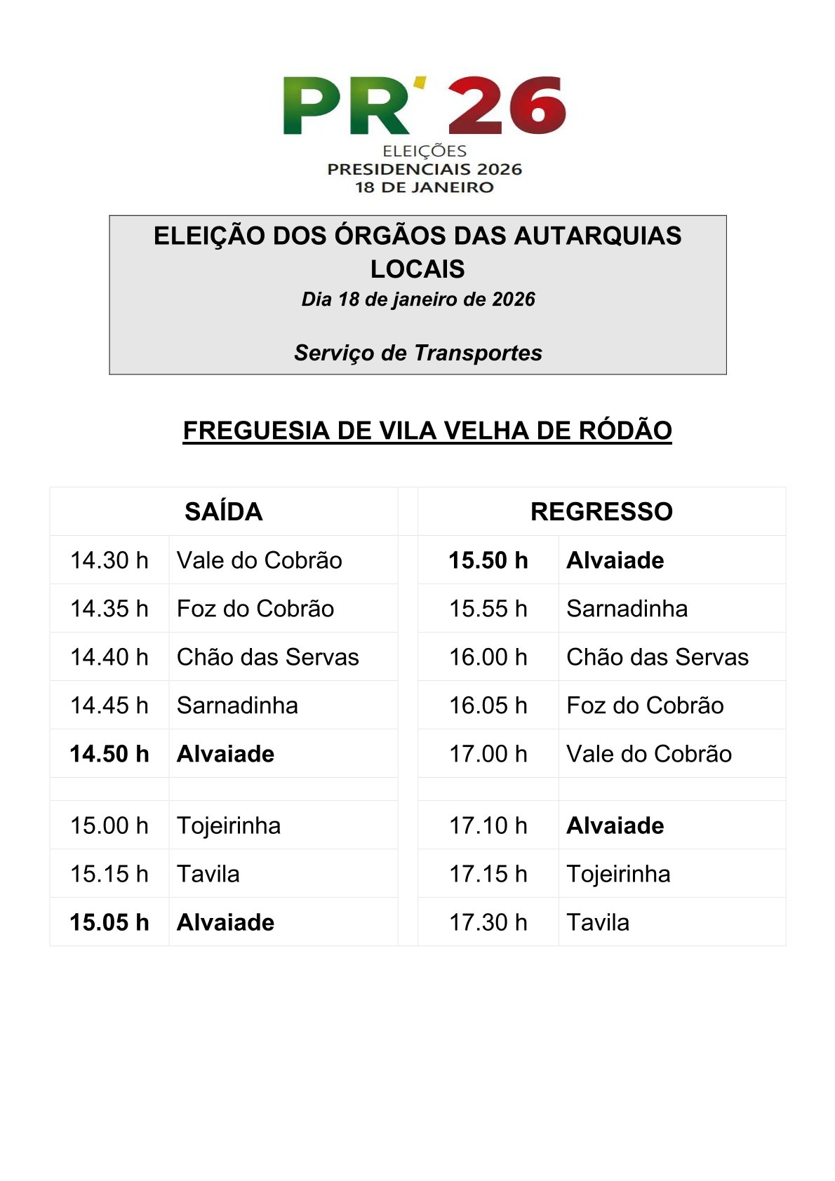De forma a assegurar o direito de voto na Eleições Presidenciais que se realizam no próximo domingo, dia 18 de janeiro de 2026, o Município de Vila Velha de Ródão disponibiliza o habitual serviço de transporte para as diferentes secções de voto do concelho, com os horários apresentados em baixo, nas imagens.